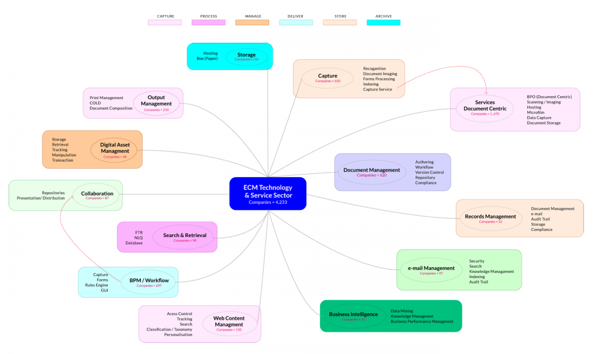 Archiving, BPM/Workflow, Business Intelligence, Forms Processing, Imaging, Indexing, Recognition, COLD, Collaboration, Content Management, Digital Asset Management, Document Auto/Production, Document Management, Document Output Management, Email Management, Enterprise Data Management, Knowledge Management, Lifecycle Management, PIM / PLM, Records Management, Storage, Taxonomy, Web Content Management.
